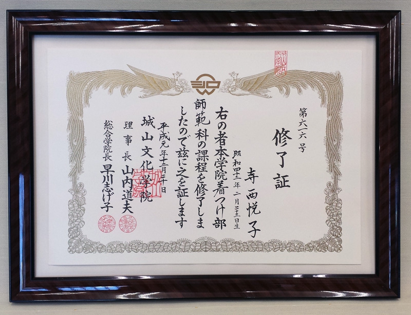 平成元年12月 城山文化学院 着付け部師範科課程修了