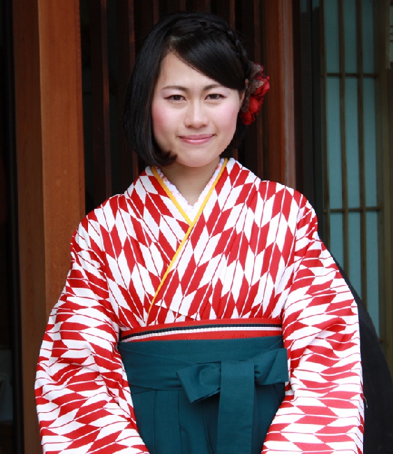 矢絣の小紋と深いグリーンの袴をあわせて清楚なイメージで…髪型もシンプルにまとめました。